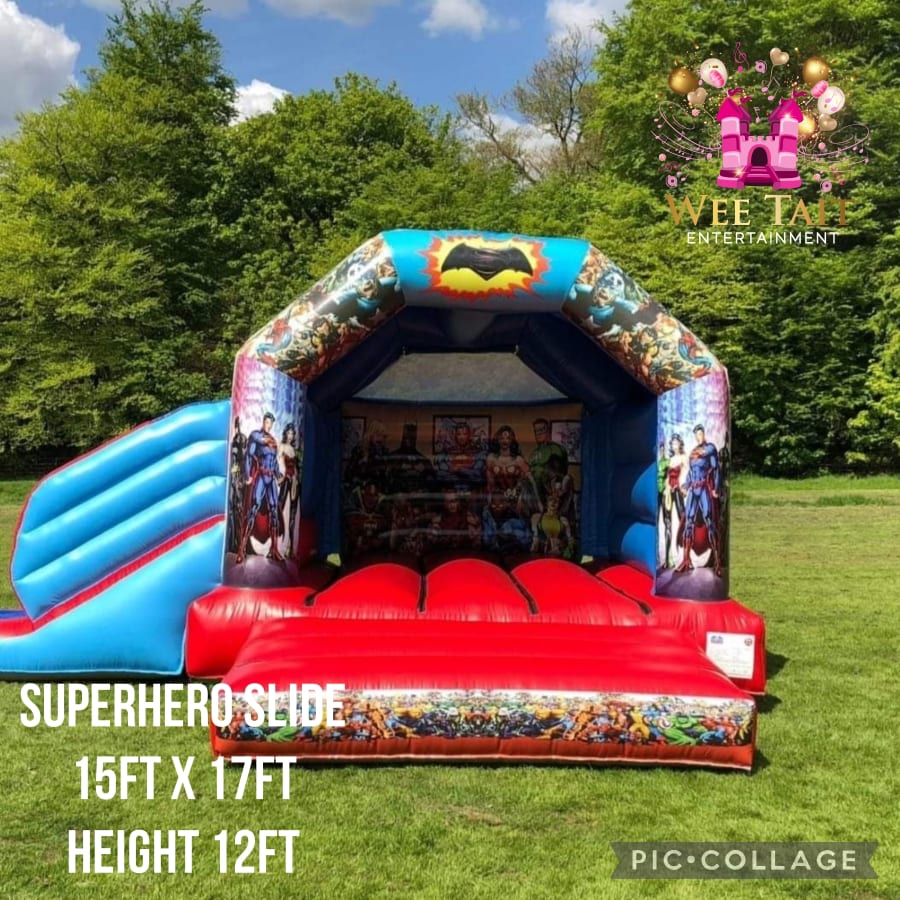 Do you like superheroes? This superhero bouncy castle is an incredible choice for all fans of the avengers. This castle shows a large selection of your favourite superheroes as well as having and amazing slide on the side.
