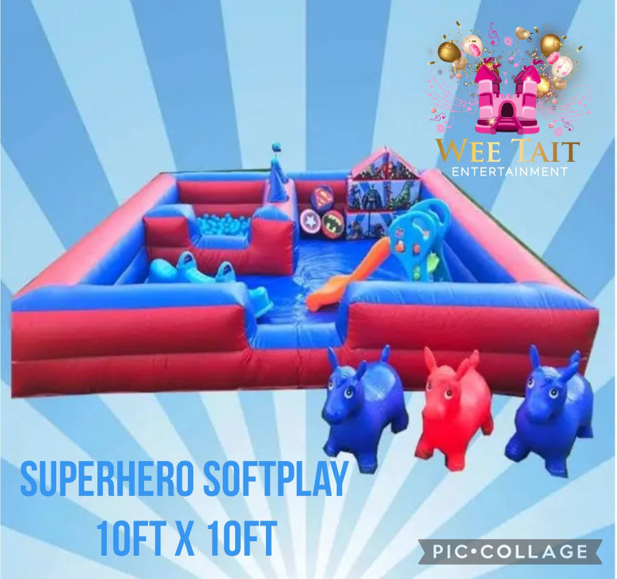 The superhero soft play station comes in an inflatable surround with built in ball pit and air jugglers with matching blue balls. There is plenty to keep the children entertained including slide, seesaw, 12 matching soft play shapes and more. This is a great addition to any party.