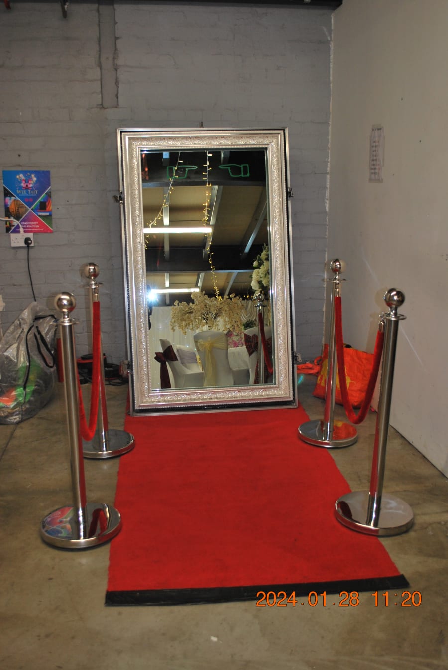 Looking to add a touch of fun and glamour to your event? Our Magic Mirror 🪄 is the perfect choice for capturing unforgettable moments at parties, weddings, birthdays, and more! This 6ft elegant mirror stands tall, accompanied by VIP red ropes and a luxurious red carpet, creating a VIP experience for your guests.