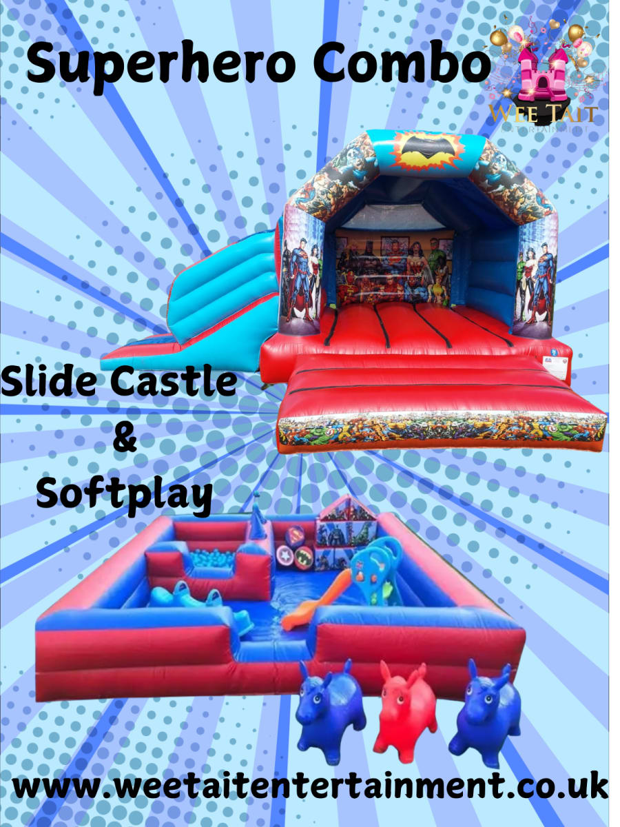 From time to time we all dream off being a super hero and wish we had super powers. Bring this dream to life with the amazing marvel themed superhero castle with slide. The superhero graphics show Batman, Captain America and many more elite superheroes. Younger guests can also feel like superheroes with our matching soft play station with built in ball pool.