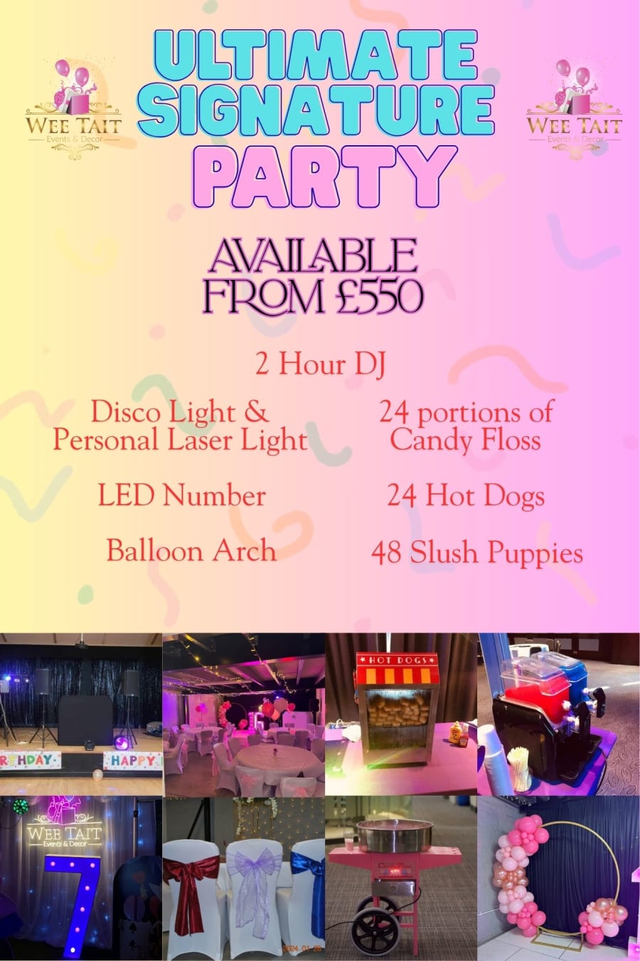 Bring energy, colour and professional entertainment to your celebration with the Ultimate Signature Party. Designed for children and teens, this all-in-one party package combines a two-hour DJ, disco and personalised laser effects, tasty treats and striking décor to create an unforgettable event. Ideal for birthdays, school celebrations and teen milestones — stress-free setup, big-impact fun. ๐งโจ